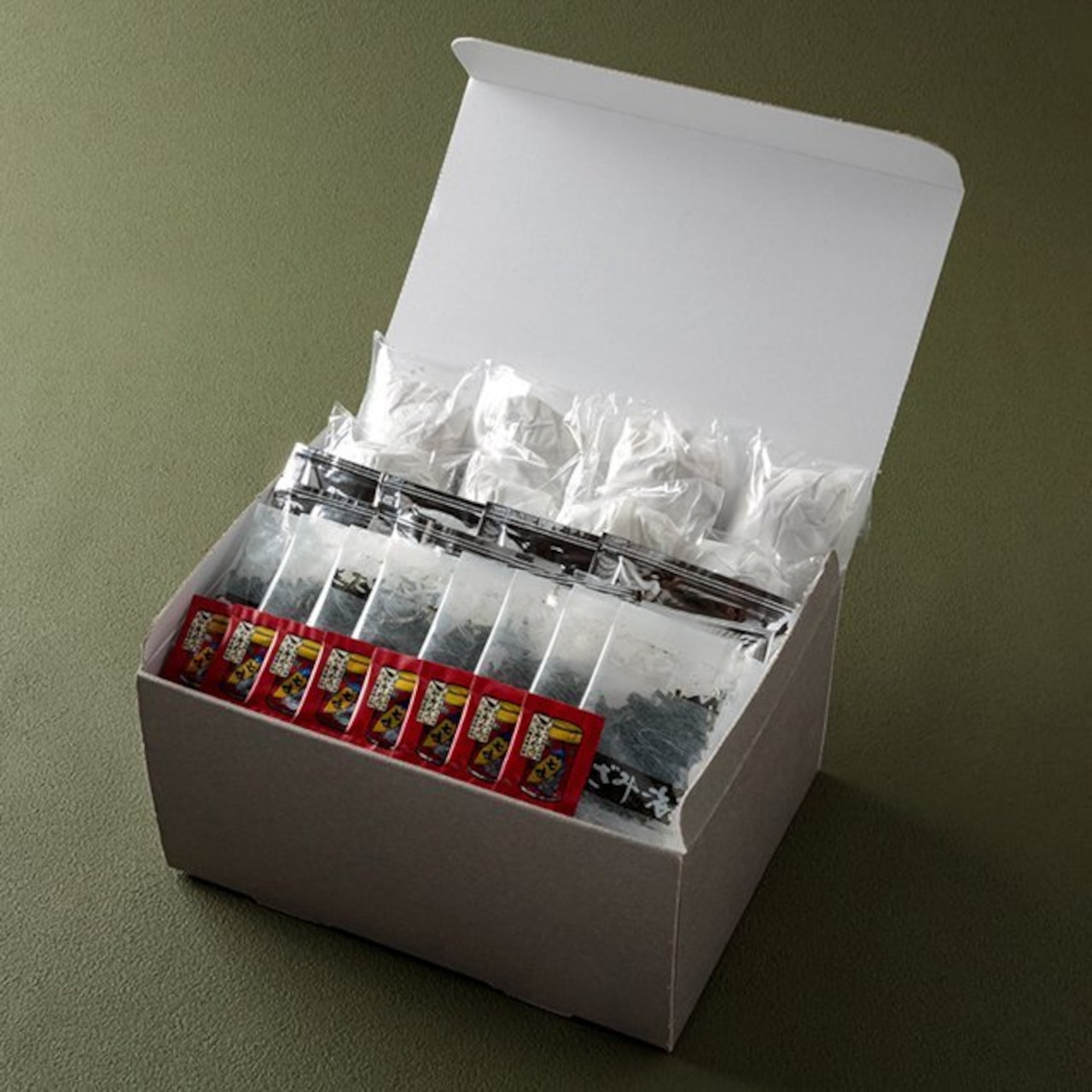 刻み海苔:乾のり/七味唐辛子:唐辛 子・陳皮・胡麻・麻種・紫蘇・山椒・生 姜、(一部に胡麻を含む)/・還元水飴・大豆繊 維・砂糖・からし・植物油脂・食塩・酸 味料・香料・着色料(クチナシ)